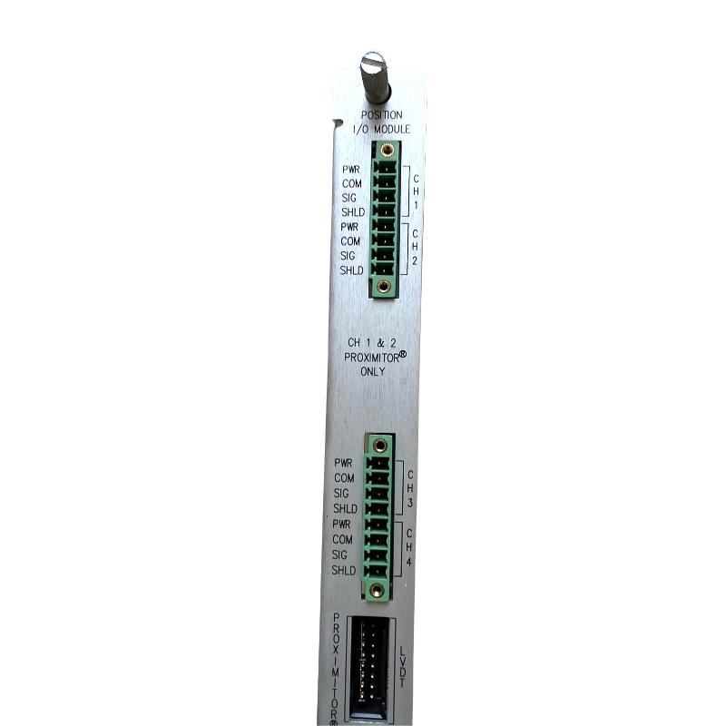 The I/O module provides sensor interfacing and signal routing between the proximity probes and the position monitor.